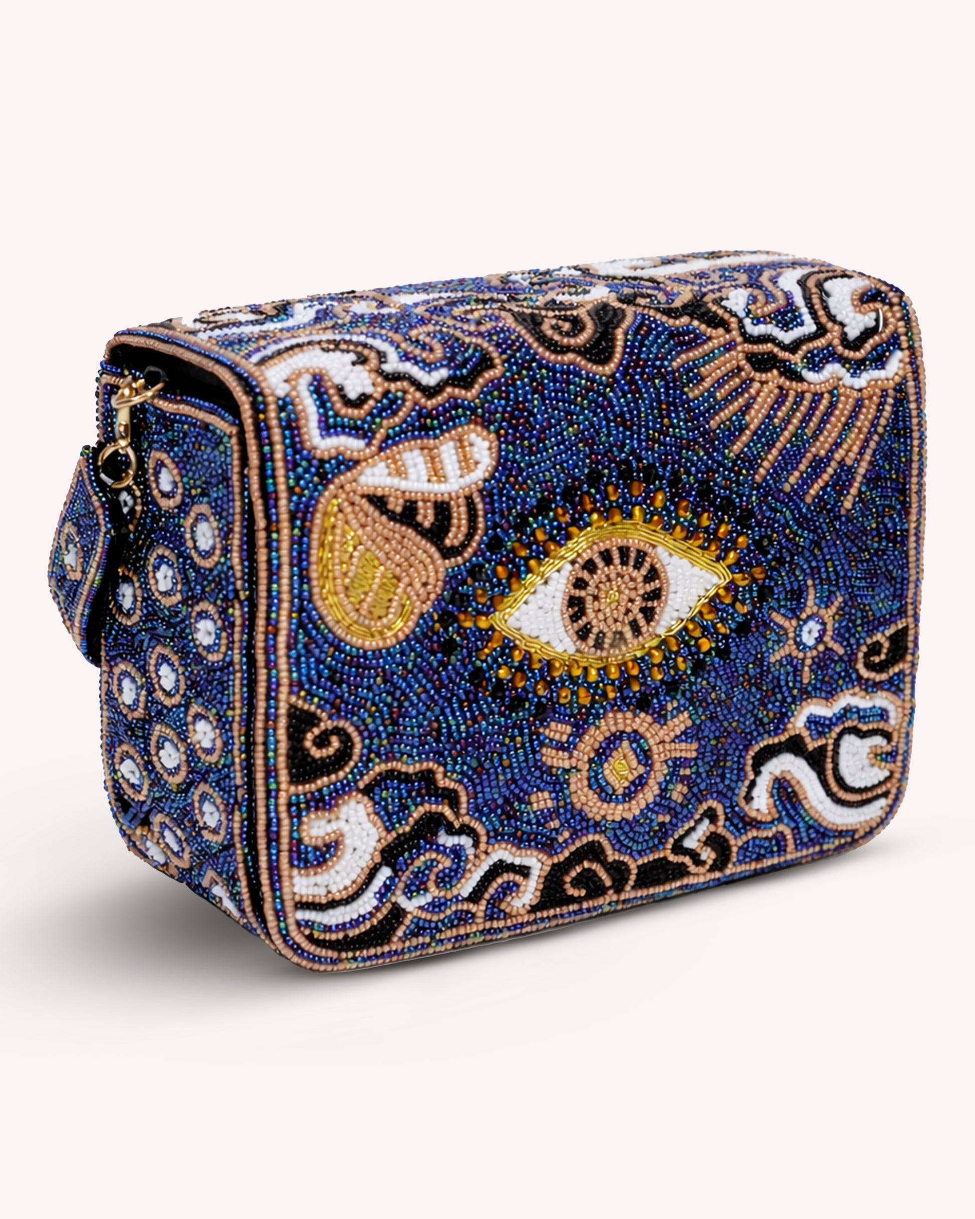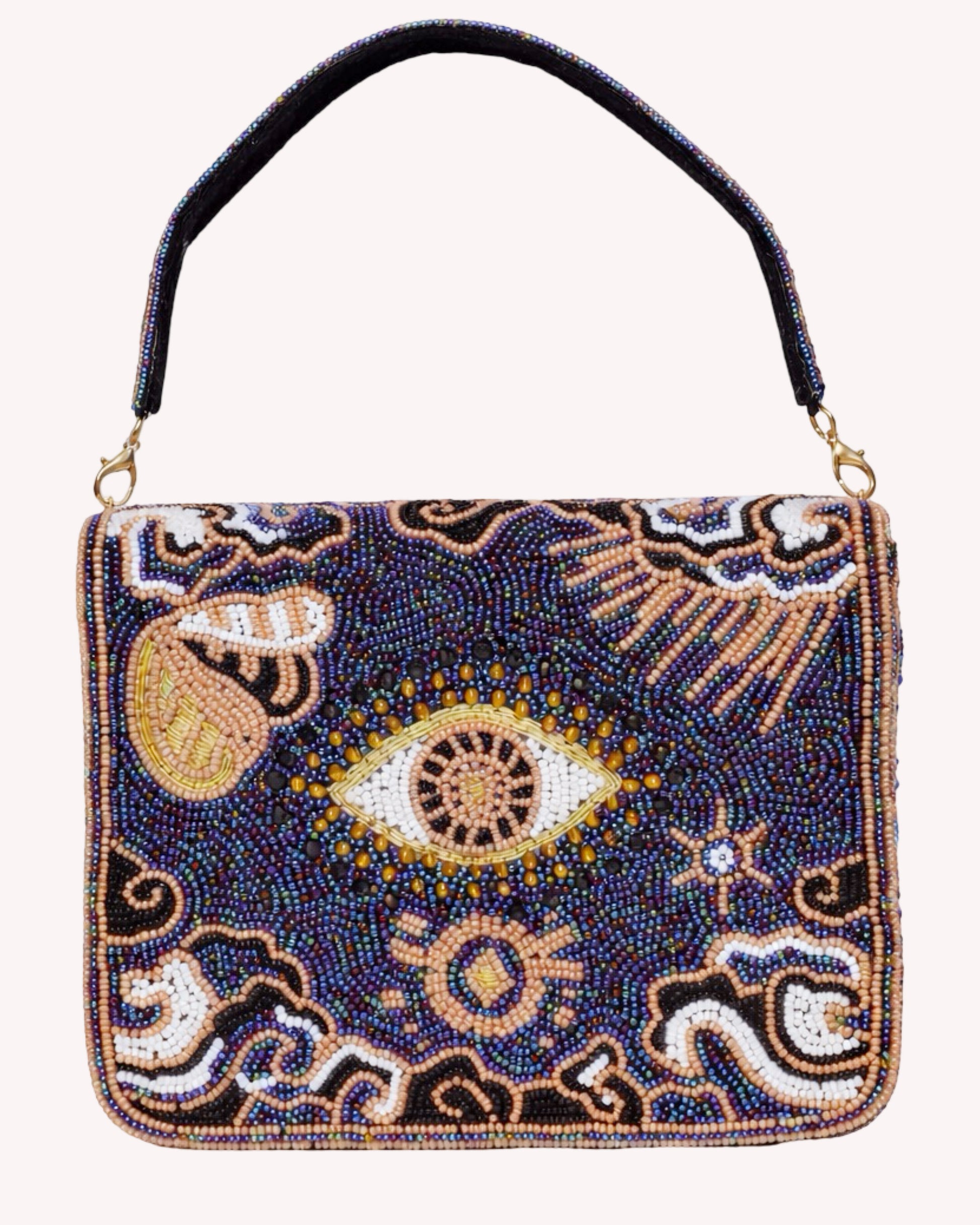 Unlock the secrets of style with the Midnight Blue Evil Eye Box Bag, a mesmerizing accessory that's sure to cast a spell of glamour on all who see it! This gorgeous bag is designed to make a statement, with its striking Midnight Blue hue and Evil Eye motif that exudes luxury and sophistication. The perfect accessory for anyone who wants to add a touch of mystique to their daily routine, this bag is both stylish and functional, featuring intricate Glass beads and Metal Spring (Dabka) embroidery, a convenient Magnetic Closure, and a short handle to carry the bag in style, with an optional Metal chain to convert it into a cross-body bag.