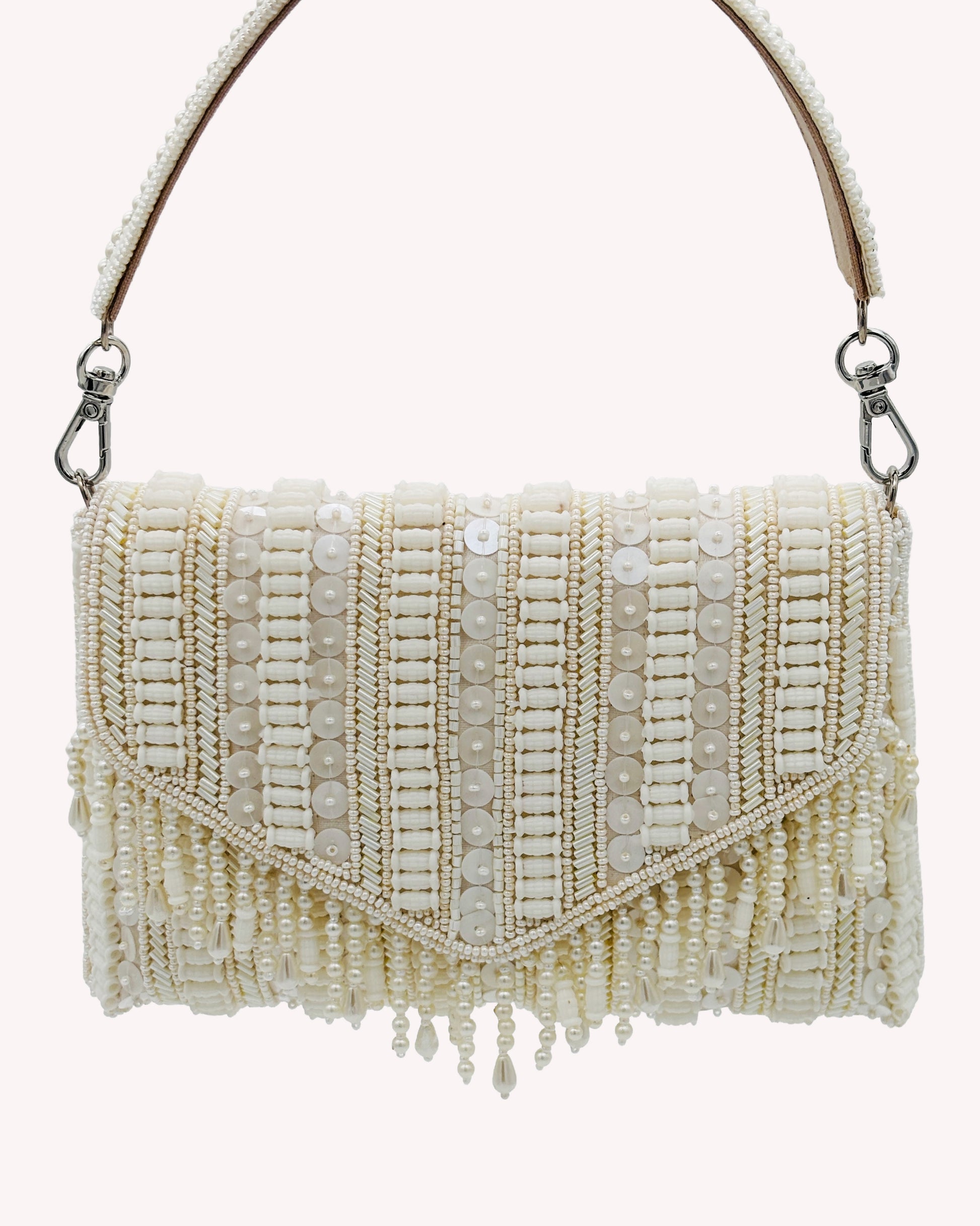The Ivory Fringe Bag features layered cream beads, sequins, and soft hanging tassels that give it a beautiful, textured look. The beaded handle adds an extra touch of detail, and the detachable strap lets you wear it comfortably on the shoulder or carry it by hand or you have an option of carrying it as a cross body bag. Its light, neutral color makes it easy to pair with almost anything — perfect for weddings, evenings out, or any moment when you want something elegant but not too flashy.