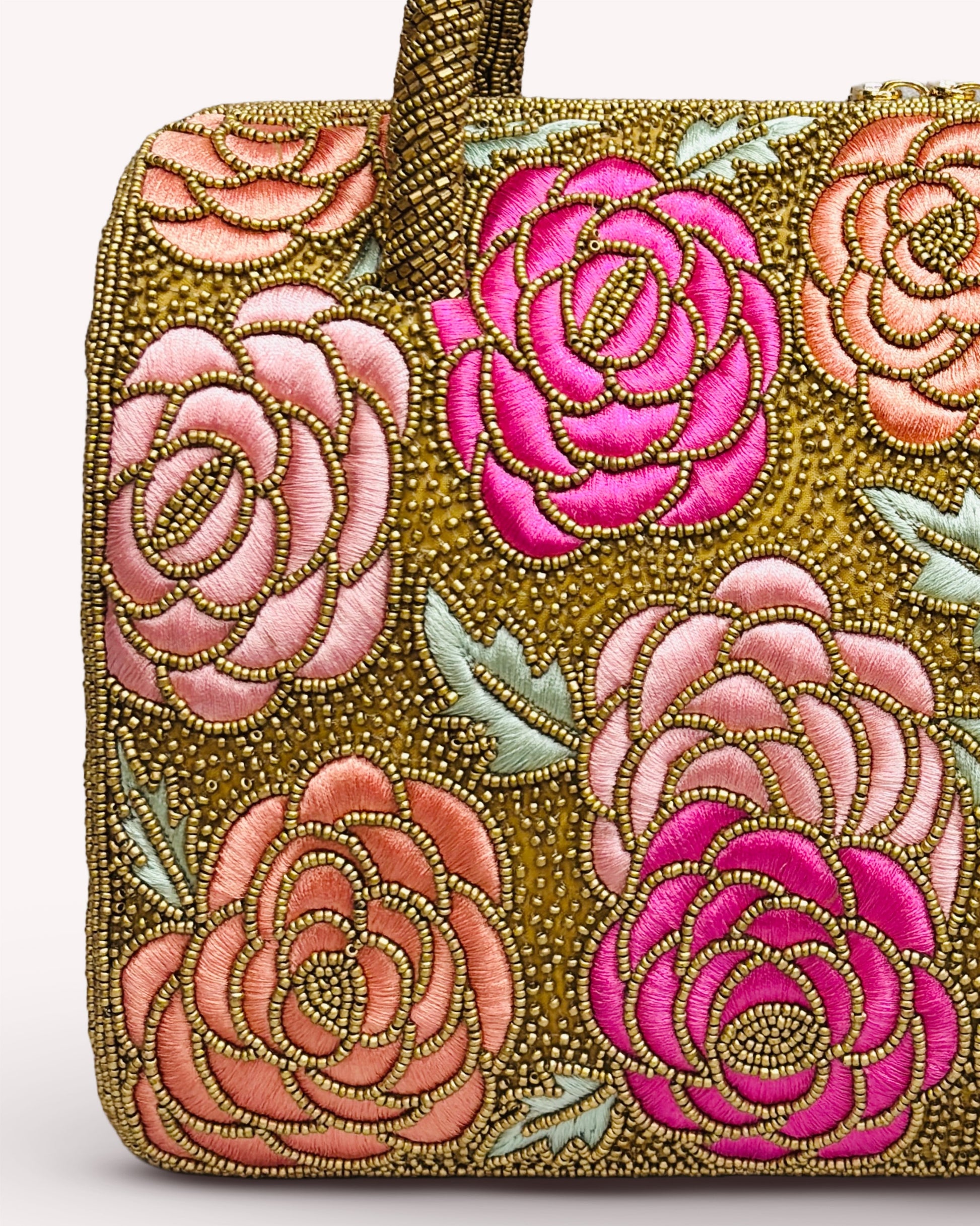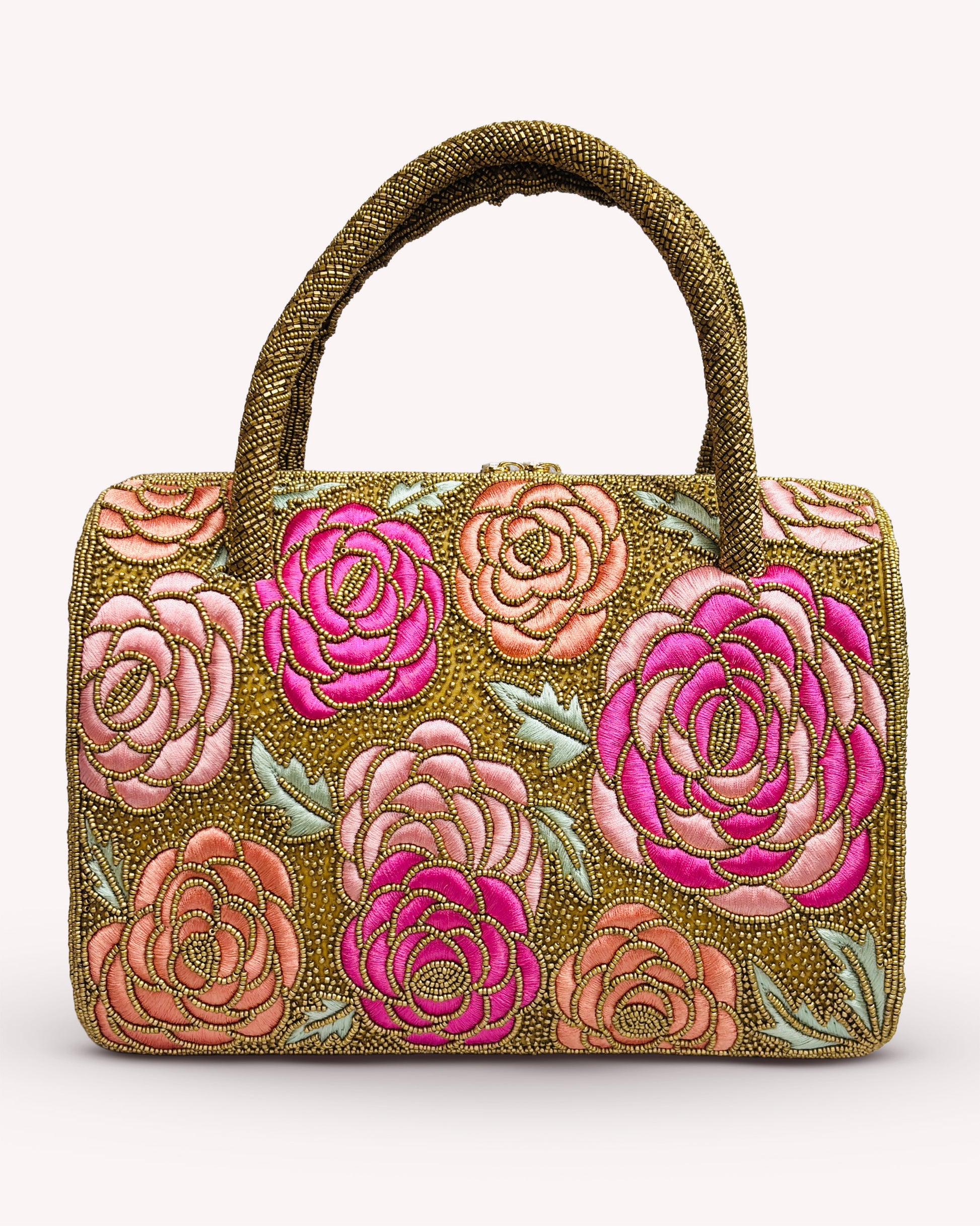 This beautifully crafted piece features intricate rose embroidery in shades of pink and coral, set against a golden bead-studded background. Designed with a sturdy handle and a compact silhouette, it’s perfect for special occasions or elevating everyday outfits. Delicate, eye-catching, and timeless—this bag is a true statement accessory.