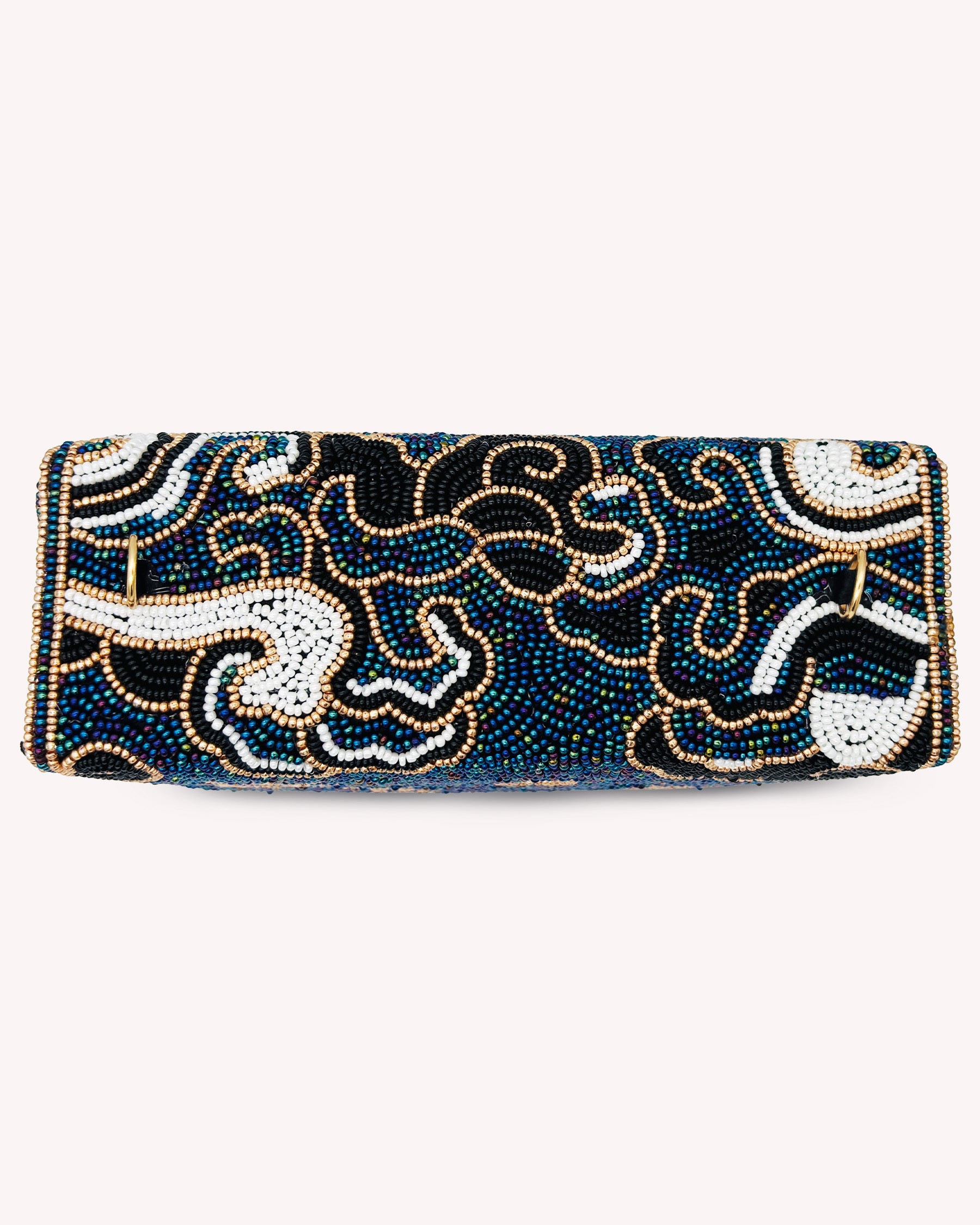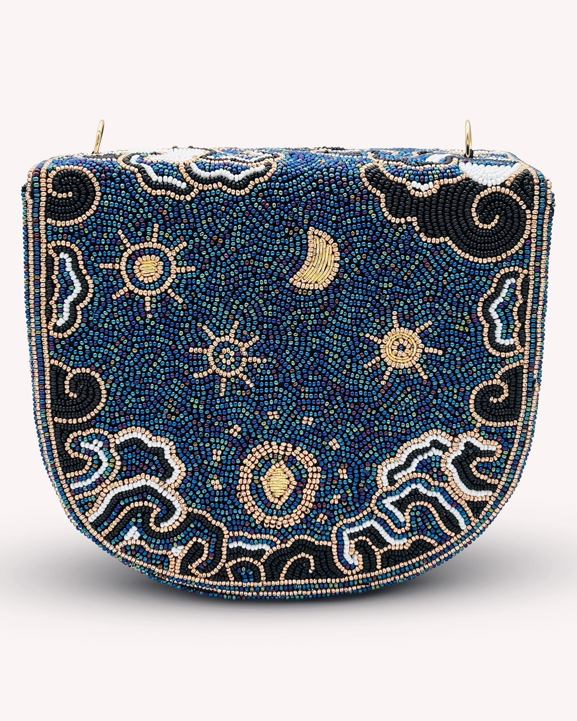 The Third Eye Moonlight Bag is a striking, hand-beaded piece inspired by symbols of protection, intuition, and cosmic beauty. Rich midnight-blue beads form the backdrop for shimmering gold accents, creating an intricate central eye motif surrounded by celestial patterns. Finished with elegant beaded tassels, this bag brings together artistry and spirituality in a timeless, wearable statement. Perfect for evenings out or adding a touch of magic to everyday style.