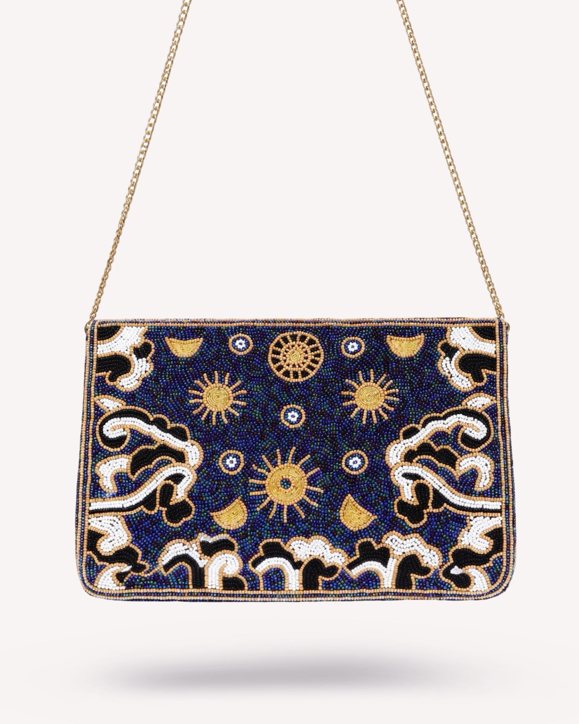 This bag is fully handmade and carefully beaded by hand, one piece at a time. The detailed eye design and flowing patterns give it a special character that makes each bag feel unique.